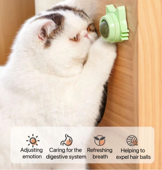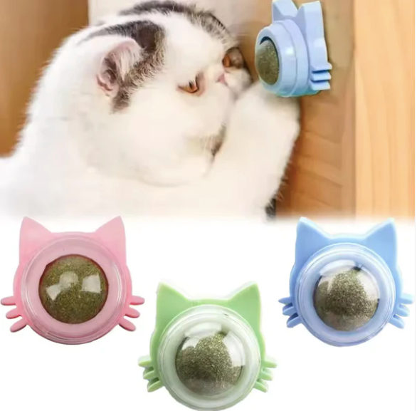 Catnip Wall-Mounted Treat BallGive your cat a tasty and engaging way to play, snack, and stay healthy with the Catnip Wall-Mounted Treat Ball. Designed to satisfy natural instincts, this rotating treat ball sticks easily to walls, windows, tiles, furniture, or doors—keeping your cat entertained and active without taking up floor space.Key Features:100% natural catnip formula, safe and non-toxicWall-mount design sticks to any smooth surfaceRotating ball spins as your cat licks or paws at itCute cat-shaped base, compact and space-savingEnrichment and entertainment in one simple designBenefits for Your Cat:Stimulates natural licking and foraging behaviorsPromotes dental health by reducing plaque buildupProvides stress relief with catnip and silvervineSupports digestion and helps eliminate hairballsKeeps cats active, happy, and engagedEasy to Use:Just peel the adhesive backing, stick it to a flat surface, and let your cat enjoy. Relocate anytime without tools or hassle.Stick it. Spin it. Lick it. Love it.