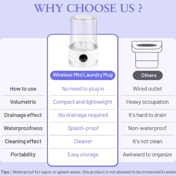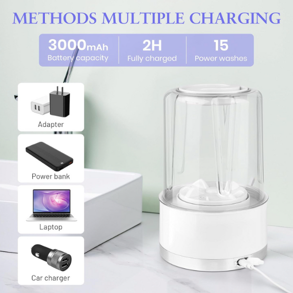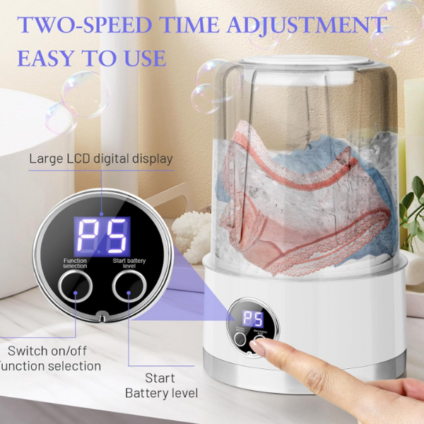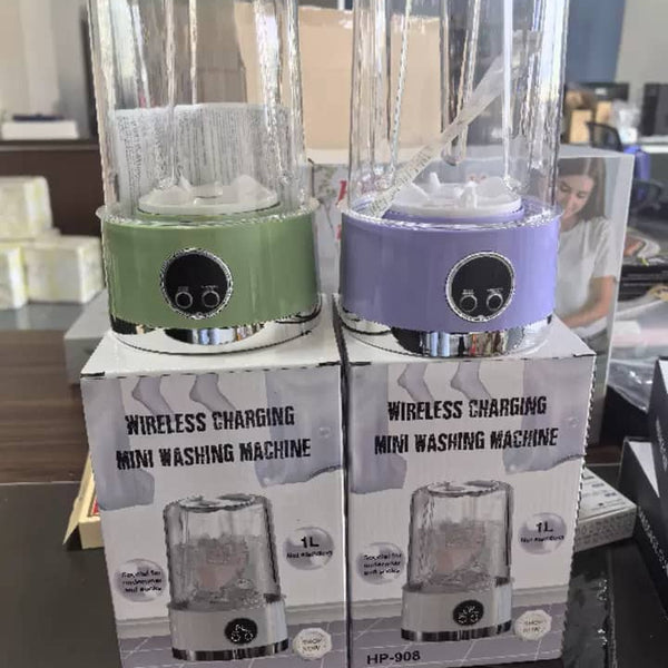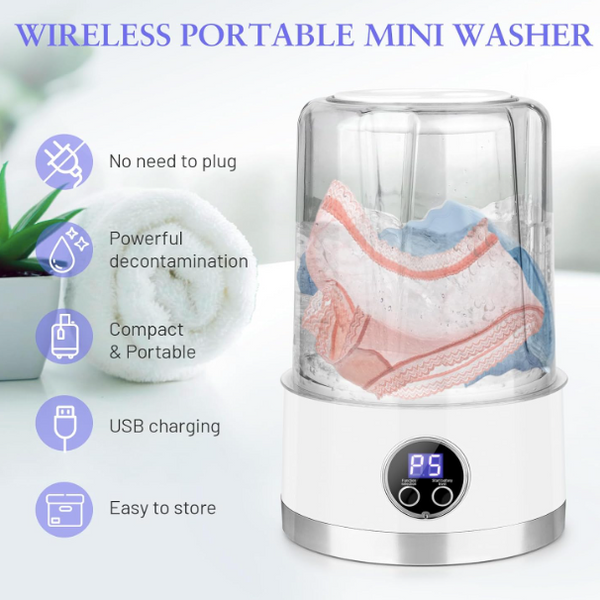 🧼 Wireless Portable Mini Washer – Wash Smarter, Anywhere You Go!Tired of handwashing your delicate clothes while traveling or dealing with tiny laundry loads at home? Meet the Wireless Portable Mini Washer — a revolution in compact cleaning that combines powerful decontamination with effortless portability.Designed for the modern lifestyle, this mini washer is wireless, USB-chargeable, and travel-ready, giving you the freedom to wash essentials anytime, anywhere — no sink, no hassle, no compromises.🌀 How It Works:Using a high-frequency turbine rotation and bubbling action, the mini washer generates a whirlpool effect that lifts dirt and grime from clothing fibers. Combined with water and detergent, this action penetrates deep into the fabric for a thorough clean in just minutes — all without damaging delicate items.Simply:Add water and detergentDrop in your clothesSelect your wash timeLet it spin — then rinse and dry as needed!🚿 Quick Wash, Big ImpactForget about soaking clothes in a sink or wasting time hand-scrubbing. With this mini washer, even light daily laundry becomes fast, easy, and efficient. It’s a great way to wash personal items separately — for hygiene and convenience.Bonus: It reduces wear-and-tear compared to traditional machines.🌿 Eco-Friendly WashingSmall loads? Don’t wait for laundry day. This washer lets you clean only what’s necessary, saving water, energy, and time. It’s ideal for those who want to minimize their environmental impact while still enjoying the luxury of fresh, clean clothes.